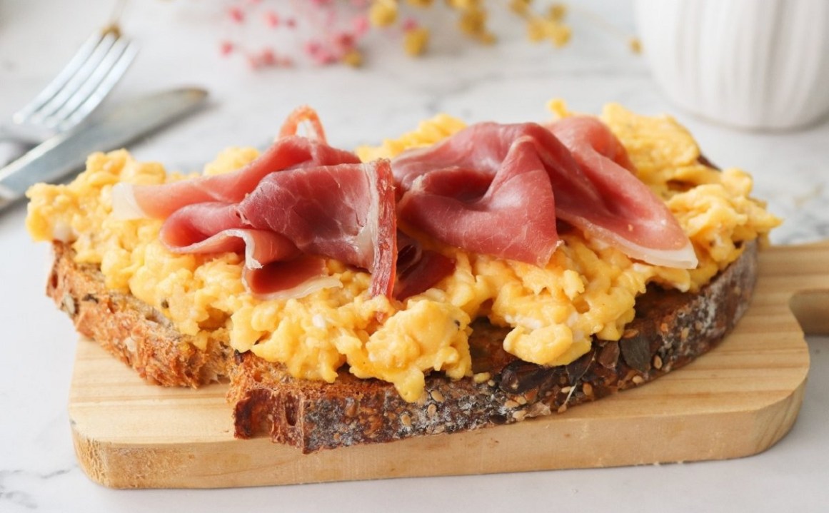 Freír el tomate con un poco de sal. Batir los huevos con la leche y la manteca pomada. Verter en una sartén que no se pegue y cocinar con el jamón en tiritas revolviendo. Cuando esté espesando el huevo, poner el tomate frito. Servir con pan lactal, frito en la sartén del tomate, y un poco de lechuga fresca (arrepollada mejor).