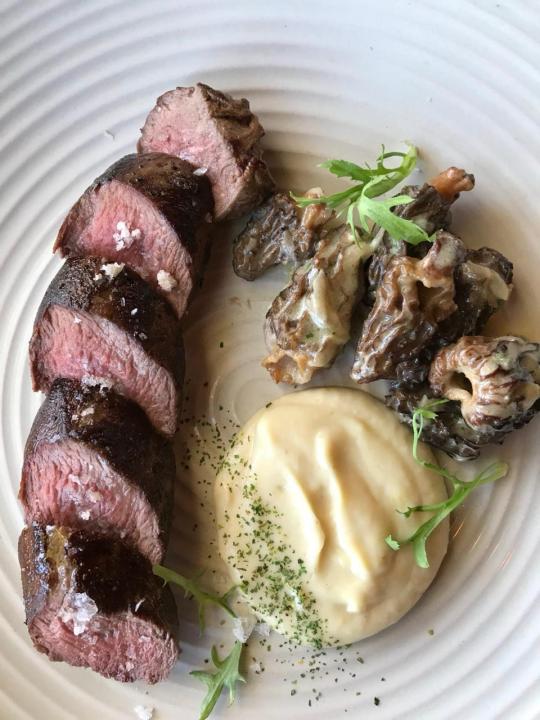 Hidratar las morillas en agua por 10 minutos. Sofreír cebolla brunoise en un sartén. Antes de que tome color agregar las morillas, desplazar con vino blanco y agregar 150 cc de crema, sal y pimienta. Reducir la crema y agregar zest de limón y cibullete picada muy fina.