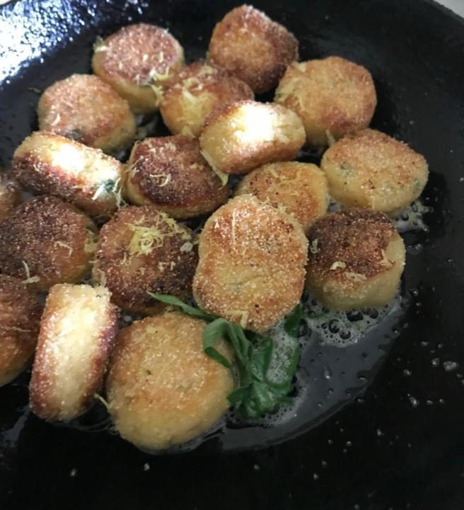 En una olla colocar la leche, manteca, sal, pimienta y nuez moscada. Llevar a ebullición y luego bajar el fuego e incorporar la sémola. Revolver hasta que tome cuerpo e incorporar el queso y retirar del fuego una vez que se obtenga una pasta homogénea. Dejar que baje la temperatura para incorporar las yemas . Enfriar. Estirar y dar forma utilizando un cortante redondo pequeño. Dorar de ambos lados en una sartén. Agregar una nuez de manteca, salvia y zest de limón. Opcionalmente se puede servir con salsa d tomate.