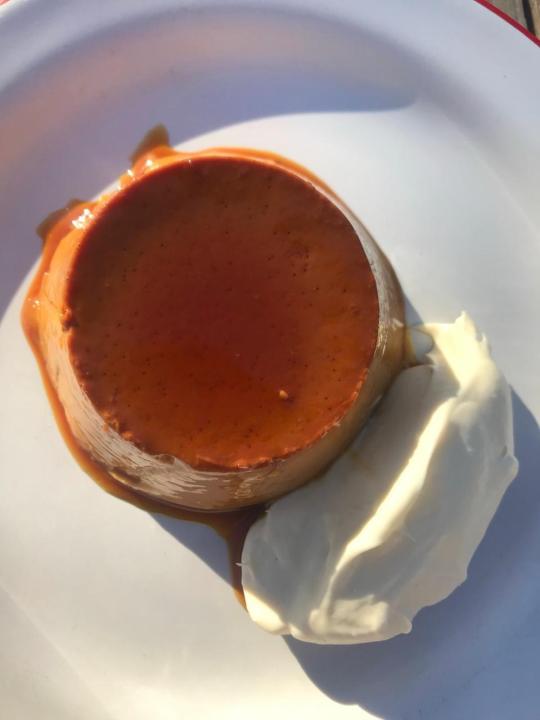 Calentar en olla la leche junto con la crema. Por otro lado unir sin batir enérgicamente (para no incorporar aire) el resto de los ingredientes. Mezclar la leche caliente con la mezcla homogénea y colocar en moldes pequeños con caramelo líquido en su interior (1 parte de azúcar caramelo y 1/2 parte de agua). Montar la crema, opcional agregarle azúcar.