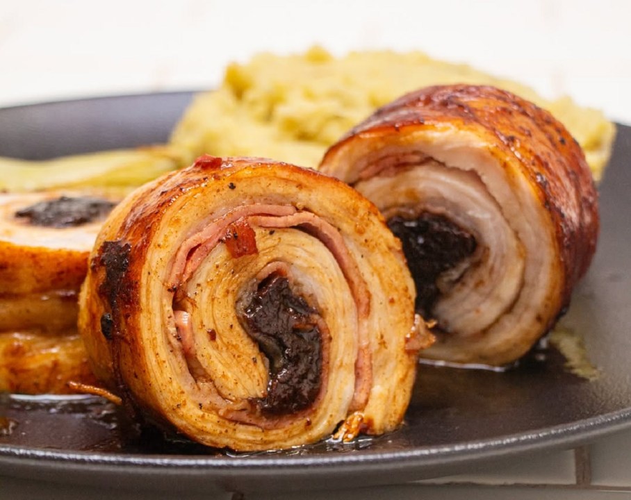 3. Untar con mostaza, colocar la panceta cubriendo la superficie. Luego agregar las ciruelas haciendo una línea. Enrollar, bridar y colocar en una placa con vegetales a elección. Llevar al horno por 1 hora y media o 2 a 180° C.