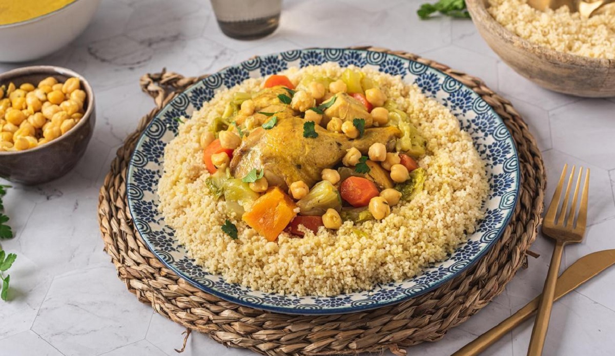 3. Hidratar aparte el cuscús, debe estar cocido, pero no pasado. Al final mezclar todo: el pollo, el cuscús y el caldo. Servir en plato hondo.