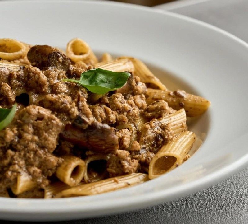 MARTES: Penne rigate con ragú blanco de cerdo y hongos