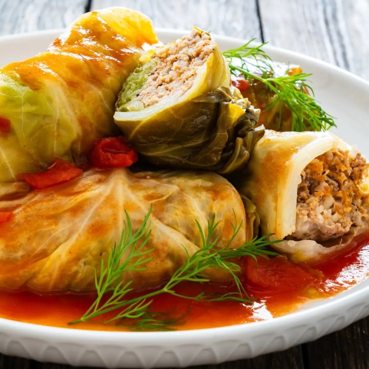 3. Extender las hojas de repollo, rellenarlas y enrollarlas en si mismas confeccionando paquetitos. Servir dando un golpe de horno a los paquetitos con la salsa de tomate por debajo.
