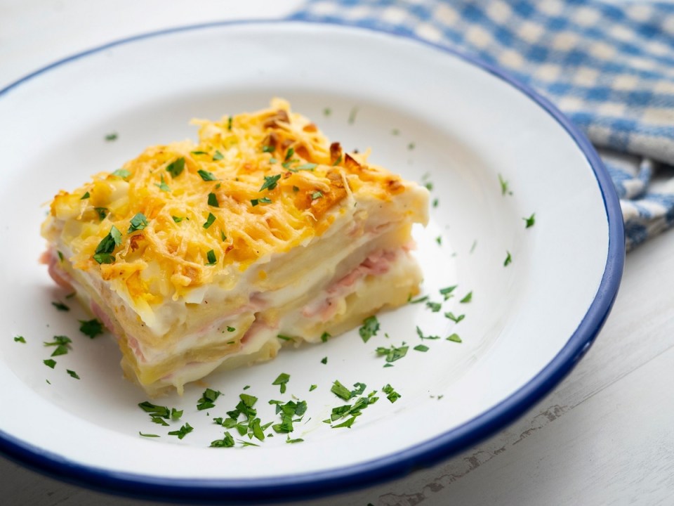 1. Lavar las papas y cocinarlas con piel. Una vez cocidas pasarlas por un tamiz. Añadir 100 gr de manteca, el jamón picado, el queso rallado, las yemas de huevo (guardar las claras), una pizca de nuez moscada y sal.