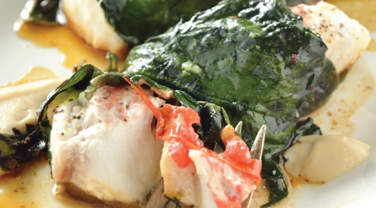 1. En una sartén poner a dorar los filetes de merluza con aceite y un poco de manteca. Salpimentar y reservar. Blanquear las espinacas en agua caliente y pasarlas a agua helada. Dejar enfriar. Poner en una tabla las hojas de espinaca formando una sábana y por encima poner la merluza con un poco de manteca. Envolver los filetes con las hojas hasta que quede totalmente envueltas. Reservar.