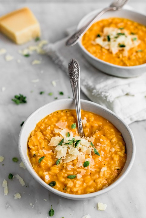 4. Repetimos esta operación hasta que el arroz esté tierno y cremoso, durante 15 minutos, aunque el tiempo depende mucho del tipo de arroz. Cuando veamos que el arroz está al dente, retiramos del fuego, agregamos la manteca y el queso e integramos todo. Servir inmediatamente.