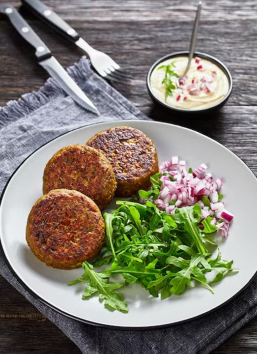 3. Apartamos a un bol, con las manos mojadas, le damos forma de hamburguesa y pasamos por un poco de pan rallado. Es importante darle frío para que queden firmes y no se desarmen a la hora de cocinar. Servirlas con ensalada de rúcula.