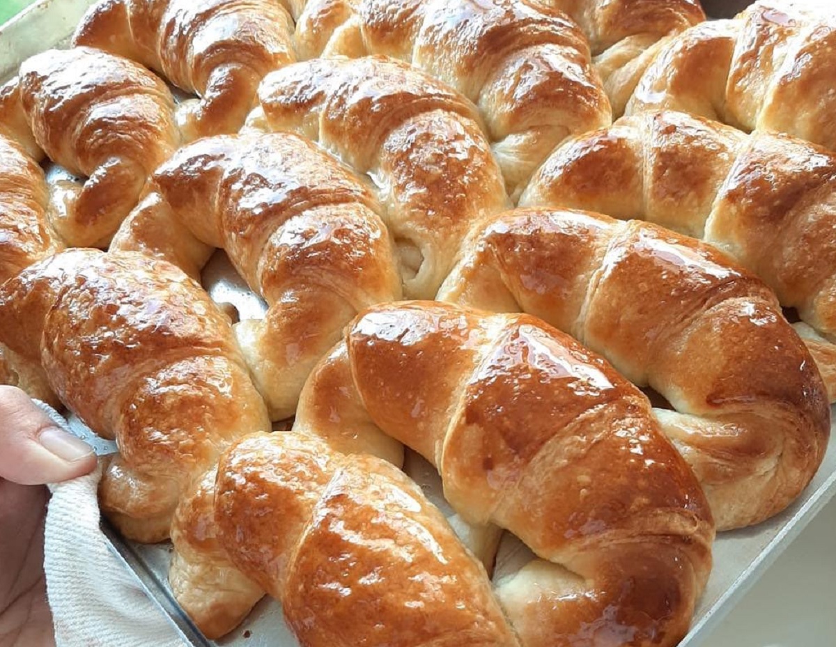 Cortar triángulos de 10 cm de ancho (base) por 12 cm de alto, aproximadamente. Tomar los triángulos y enrrollar comenzando desde la base, hacia la punta. Colocar directamente sobre la placa enmantecada y doblar las puntas para lograr las medialunas. Pintar todas las facturas con huevo o doradura y dejar fermentar. Hornear, en horno pre calentado, a 220° C de 12 a 15 minutos. Para las medialunas, algunas pincelarlas con almíbar y otras abrir con tijera, por detrás y rellenar con dulce de leche. Espolvorear con azúcar impalpable.