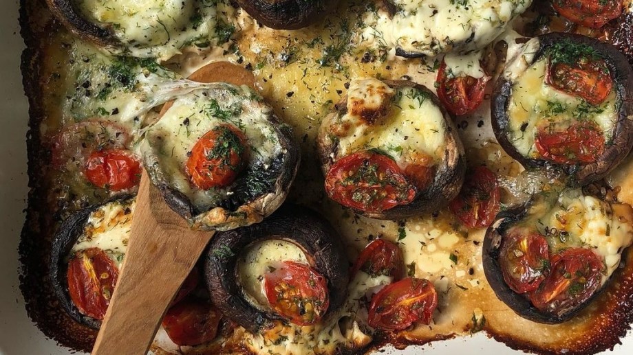 Cortar el queso en cubos y los cherry al medio. Picar el eneldo con el ajo. Corta los tronquitos de los hongos (solo vamos a usar las cabecitas, con el resto podés hacer una tarta y utilizarlos en el relleno). En una fuente para horno agregar aceite de oliva. Acomodar las cabecitas en la fuente. Agrega un cubito de queso en cada una. Añadir los cherrys y el eneldo/ajo picado. Rallarle queso por arriba. Lleva a un horno precalentado a 180° C (medio) hasta que se cocinen los porto y se gratine por arriba.