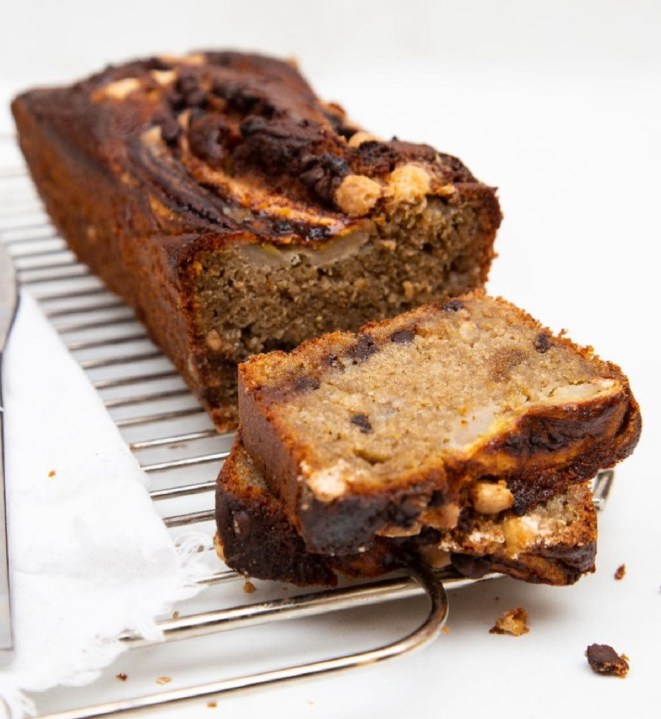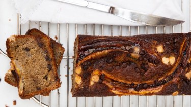 Mezclar bien con una espátula hasta obtener un compuesto homogéneo, entonces verterlo en el molde de forrado la base con papel manteca. Agregar a la superficie fetas de bananas y algunos chips de chocolate. Cocinar al horno precalentado a 180° C durante una hora.