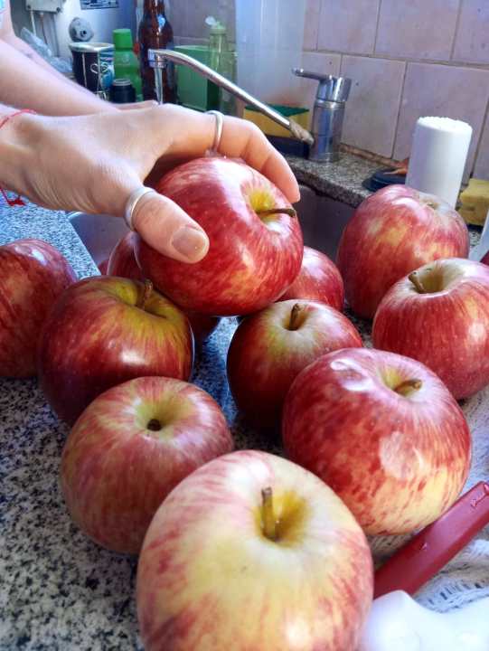Ro y Rocío siguen con las zanahorias y calabazas que donó Nacho, productor agroecológico de la región. Valeria espera su momento para condimentar. Yitel y Brenda ven la bacha despejada y avanzan con la selección, lavado y secado de las manzanas.