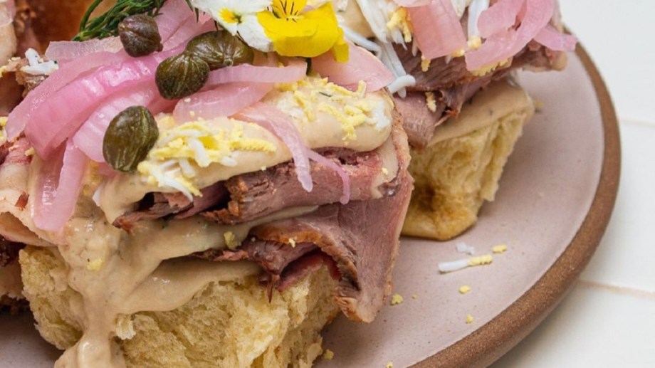 Sandwich de vitel toné con berenjenas al escabeche y cebollas encurtidas