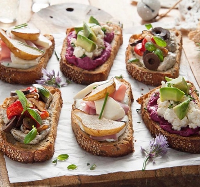 Cocinar las remolachas y procesar con los garbanzos, el sésamo, aceite de oliva, sal y pimienta a gusto. Por otro lado, escurrir la ricota, colocar en un recipiente con las hierbas y condimentar con oliva, ralladura de limón, sal y pimienta. Mezclar. Para armar, untar el pan con la crema de remolachas, poner arriba la ricota especiada y la palta en cubos. Terminar con oliva y pimienta.