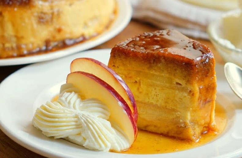 Sobre la base del molde acaramelado colocar una capa de rodajas de manzanas cortadas más gruesa, luego poner una de pan con la manteca hacia abajo. Disponer una capa de manzanas. Continuar alternando pan y manzanas; la última capa debe ser de pan con la manteca hacia arriba. Verter lentamente el ligue.