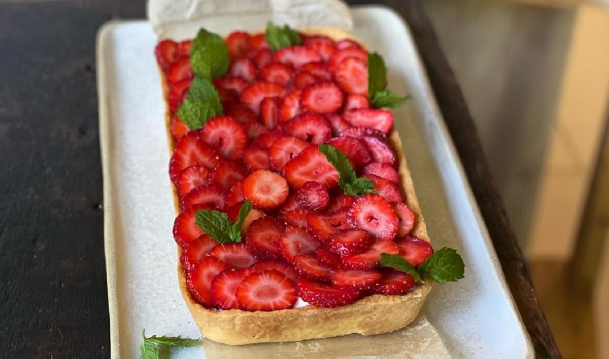 Hacer la masa de tarta de la forma tradicional. Colocarla en un molde y cocinarla por completo en horno medio (170° C ) dejar enfriar antes de armarla. Agregar una base de la crema y terminarla con abundantes frutillas fileteadas y menta.