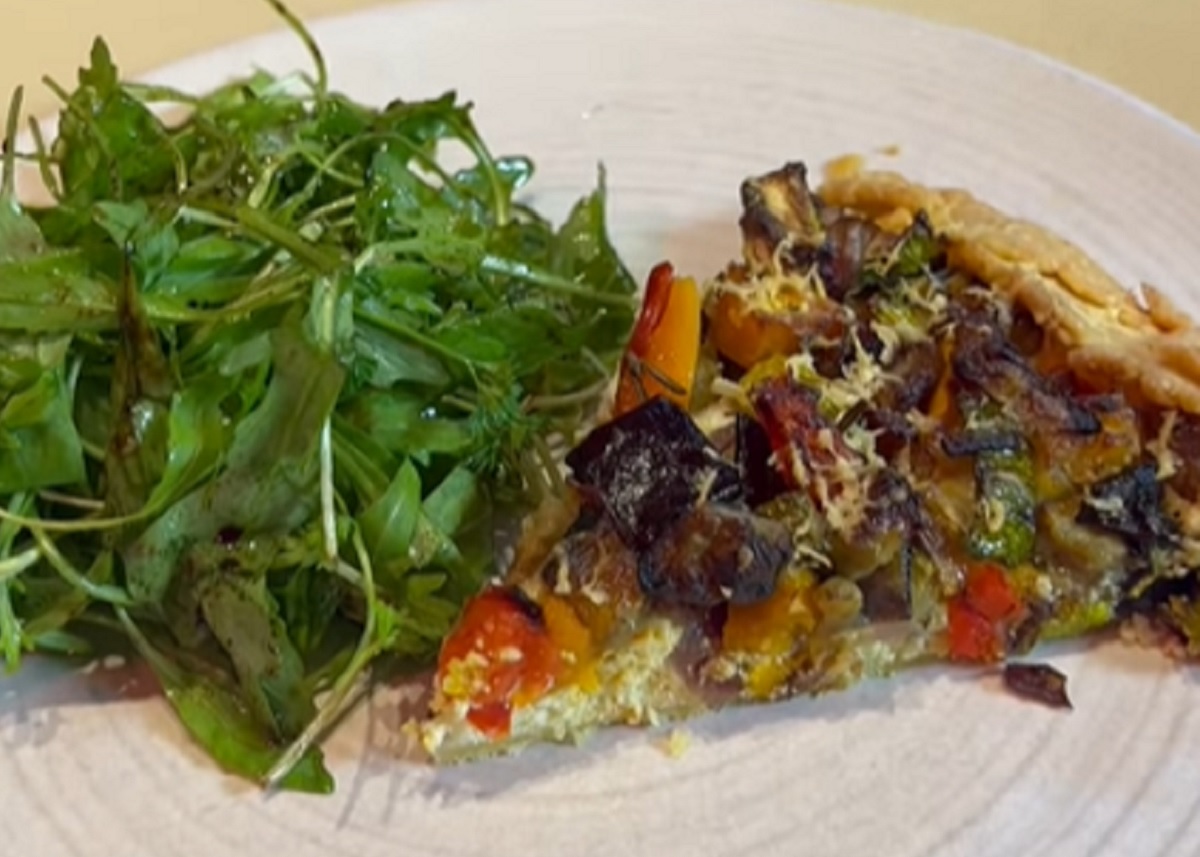 Forre un molde de 35cm de diámetro aproximadamente con papel manteca enmantecado. Estire la masa. Colóquela en el molde y pinche el fondo con un tenedor. Disponga el relleno cremoso sobre la tarta, distribuya los vegetales horneados sobre el relleno, ralle queso sbrinz por encima y lleve al horno a 180° C por 30 minutos hasta que esté dorada. Sirva tibia con ensalada de rúcula u otras hojas verdes a su elección.