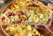 Estirar la masa colocar en una tartera y rellenar con la mezcla. Cortar la cebolla en aros finos y colocar sobre el relleno. Cocinar en un horno moderado unos 40 minutos.