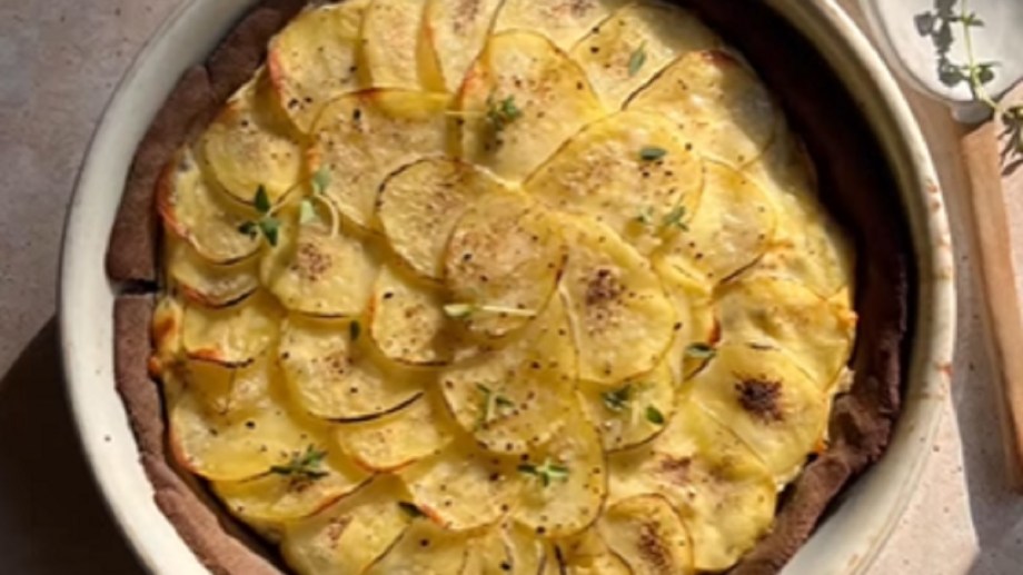 Para la masa a la hora de mezclar los elementos, vamos a usar agua cantidad necesaria para que se una, pero que no se pegue en las manos. La vas a estirar entre papel film. La acomodás en la fuente y espolvoreas semillas de sésamo. Pinchás la base con un tenedor y la precocinás. Vas a cortar las papas con la mandolina y las hervís con sal hasta que estén tiernas sin desarmarse.