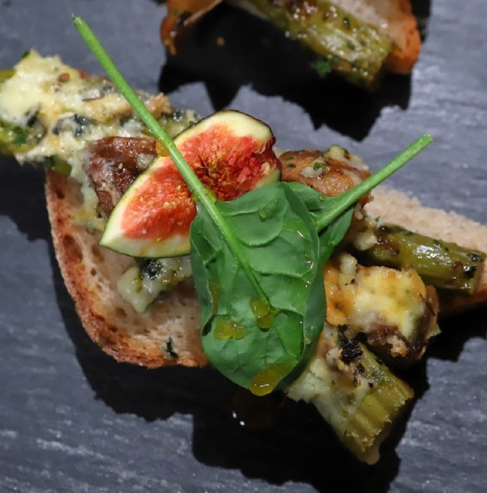 Para el armado solo hay que cortar en rebanadas pan de molde integral y luego en triángulos. Colocar los espárragos, hongos y queso azul sobre el pan. Agregar higos, hojas de espinaca y rociar con miel de curry.
