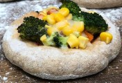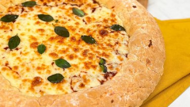 Estirar la masa, sobre una asadera aceitada. Encerrar los bastones de queso mozzarella en el borde presionando bien. Cocinar en horno previamente precalentado a 170/180º C (horno medio) por 10 a 15 minutos, es para precocinar la base. Terminar con salsa y más queso mozzarella rallado. Gratinar. Decorar con albahaca y aceite de oliva.