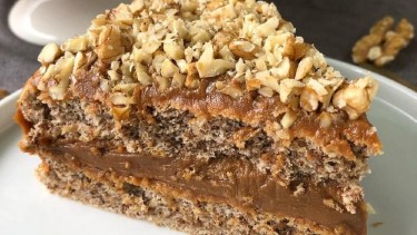 3- Luego dejar enfriar, hacer un corte, rellenar con dulce de leche y decorar con más dulce de leche y nueces.