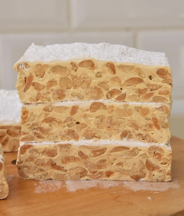 En un bol batimos las claras. Cuando están a punto nieve, bien espumosas, agregamos el almíbar en forma de hilo contra el bol. Batimos e incorporamos los frutos secos que hayamos seleccionado. Va a costar un poco integrarlos porque se empieza a poner dura la preparación, pero está bien.