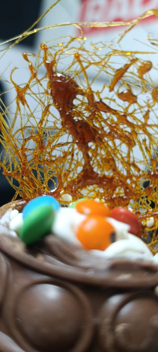 Volcá la preparación dentro del huevo de Pascua. Terminá con un toque de crema por encima y los confites. Si querés elevar la presentación, podés sumar un hilo de caramelo.