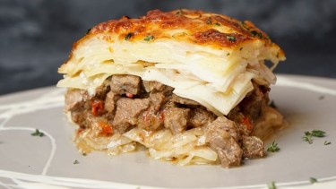 1. En una fuente para horno colocar una capa papa y una capa de cebolla morada agregar un poco de ligue y otra capa de papa. Rellenar con la carne, volver agregar otra capa de papa y otra de cebolla y ultima capa de papa un poco del ligue, terminar con mucha mozzarella.