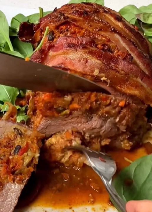 Para el rub: agregar en un recipiente paprika, ajo en polvo, cebolla en polvo, jengibre, canela, azúcar marrón y cubrir la pieza de carne. Agregar por encima lo que sobró del relleno y envolver con panceta.