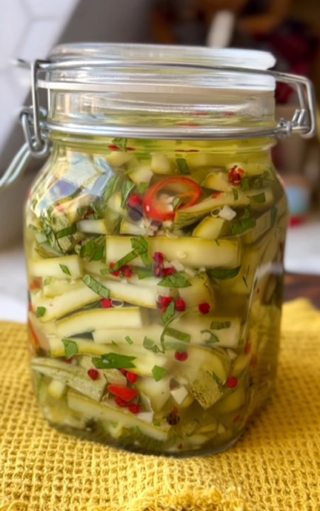 En un bol mezclar los zucchinis con la pimienta rosa, pimienta negra, chile picado, ajo picado y perejil y menta picada. Agregar aceite y mezclar. Colocar en un frasco esterilizado o en un recipiente hermético asegurándose que estén totalmente cubiertos de aceite. Conservar en la heladera cada vez que se consuman.