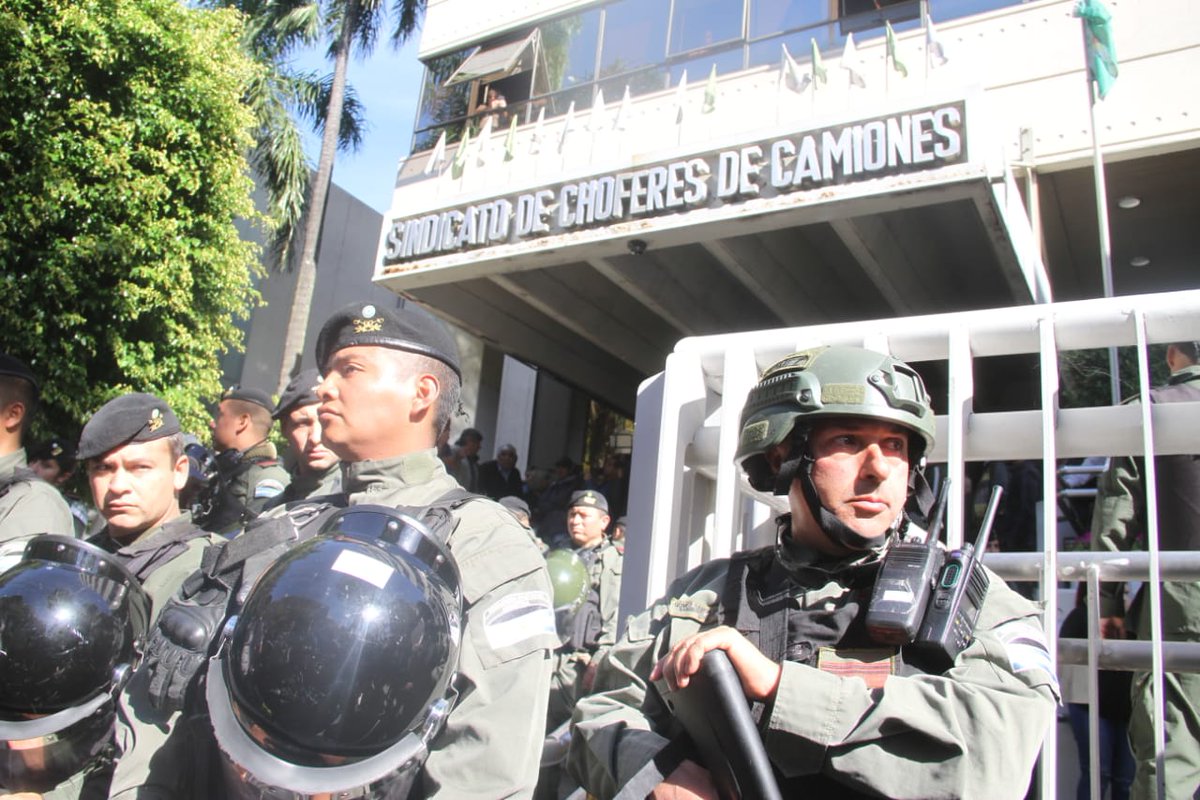 Unos 150 agentes se apostaron en el ingreso del edificio ubicado en el barrio de Constitución. Malestar por parte de la conducción sindical. Pablo Moyano apuntó: "el tema es que nos quieran plantar algo para tener una excusa para meternos en cana".