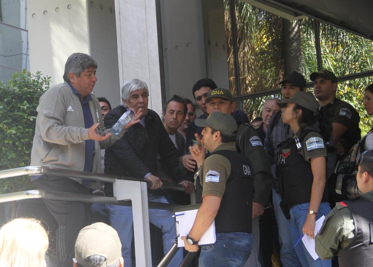Hugo Moyano y su hijo Pablo se mantuvieron en las puertas de la organización sindical durante todo el operativo.