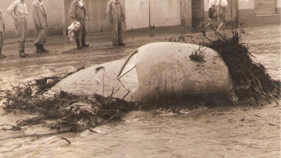 Calle Maipú, entre Tucumán y 9 de Julio, la cupé de Alberto Tamburini estaba estacionada una cuadra antes, la fuerza del aluvión la arrastró y así quedó.