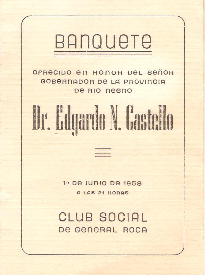 El 1 de junio de 1958 se organizó una cena en el Club Social de General Roca para recibir a Edgardo Stéfano Nazario Castello, primer gobernador electo de la provincia de Río Negro, que ocupó el cargo desde el 1° de mayo de 1958 hasta el 19 de marzo de 1962.