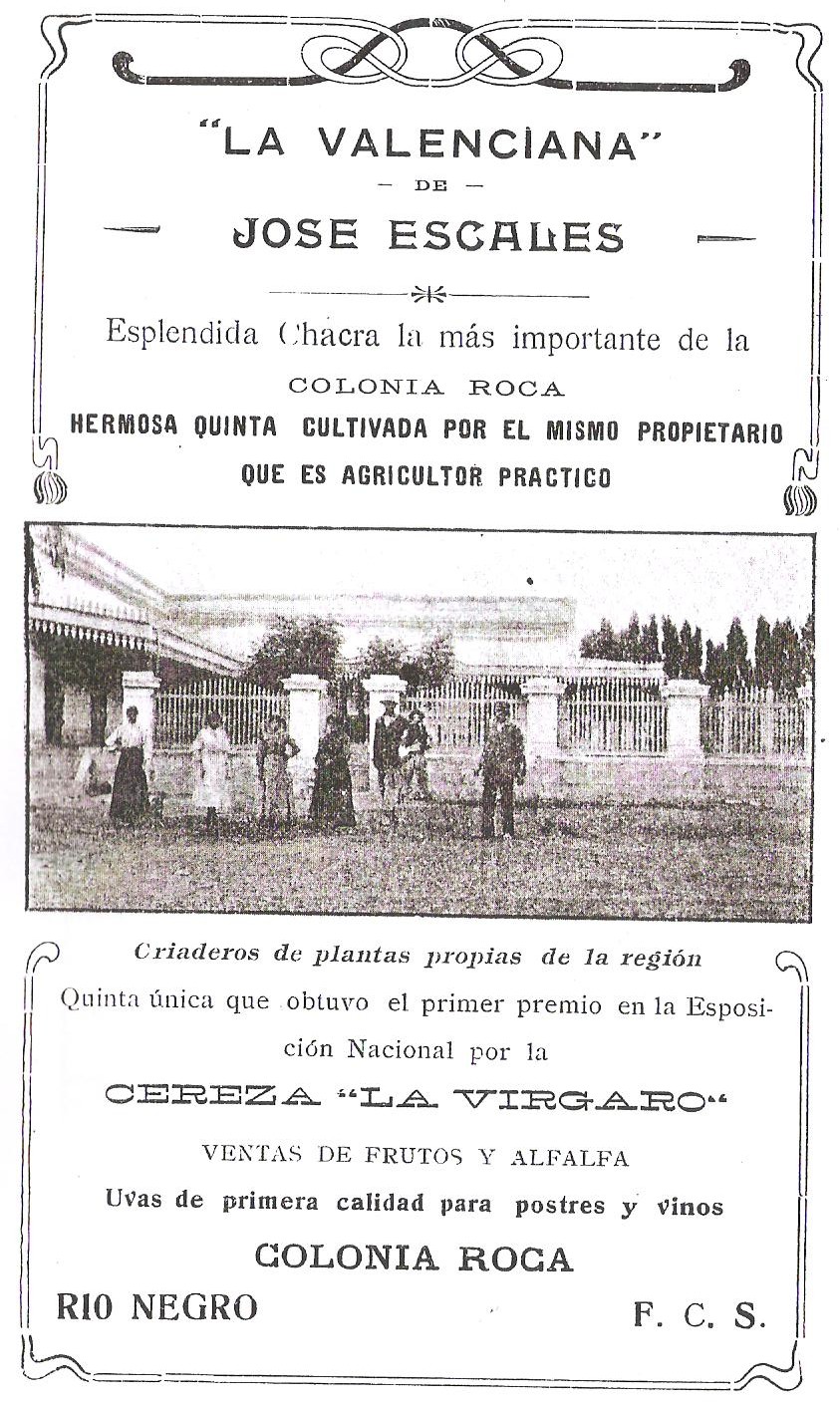 Aviso publicitario en la Guía del Pueblo y Colonia Roca del año 1911. José Escales, llegado al pueblo viejo de Roca alrededor de 1885, natural de Valencia (España), “al que con justicia se le ha reconocido como a uno de los antiguos agricultores de la época”, como sostiene Transito Leandro Toledo en su libro “Historia de la Fundación y Progreso de General Roca (R.N.) 1879-1899-1969”.