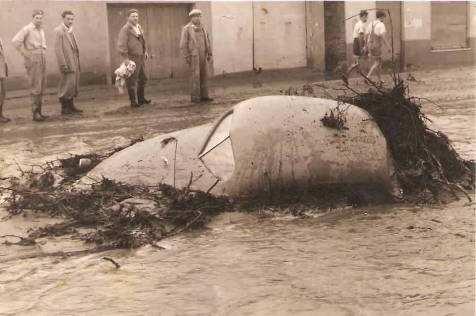 Calle Maipú, entre Tucumán y 9 de Julio, la cupé de Alberto Tamburini estaba estacionada una cuadra antes, la fuerza del aluvión la arrastró y así quedó.