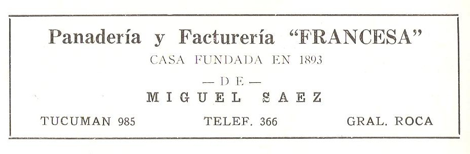 Aviso publicitario en la Guía del Pueblo y Colonia Roca de 1911, panadería fundada en 1893 por Narciso Argat. Años después, su propietario fue Miguel Saez, en la calle Tucumán 985.