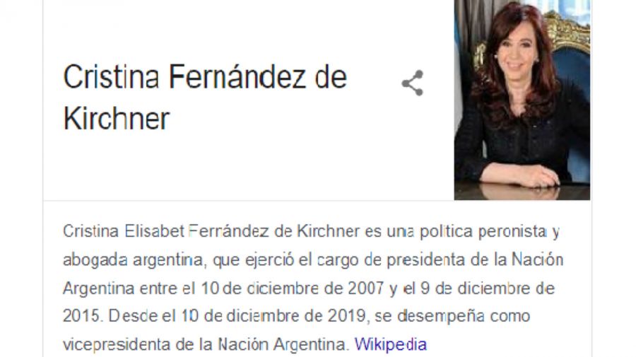 Durante algunas horas del sábado, al escribir «Cristina Fernández de Kirchner» en Google, el buscador ofrecía como descripción el cargo de «Ladrona de la Nación Argentina». La cuestión generó polémica, una cataratas de memes a favor y en contra. La vicepresidenta no se expresó publicamente sobre el tema pero la compañía tuvo que salir a explicar el asunto.