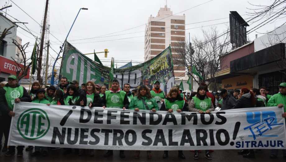 "Defendamos nuestro salario", expresó la bandera de arrastre que encabezó la movilización del Frente Sindical, conformado por ATE, Unter y Sitrajur; quienes hoy lideraron la convocatoria en el segundo día de paro por "salarios dignos" en Río Negro.