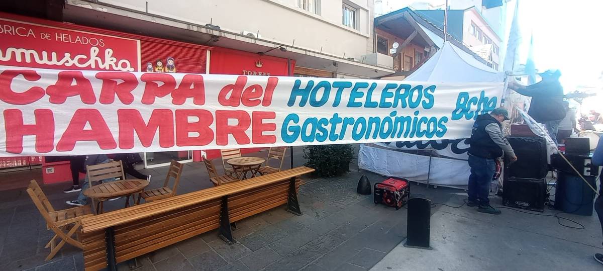 «Carpa del Hambre»: así se vive la protesta de Uthgra en el inicio de la Fiesta del Chocolate en Bariloche