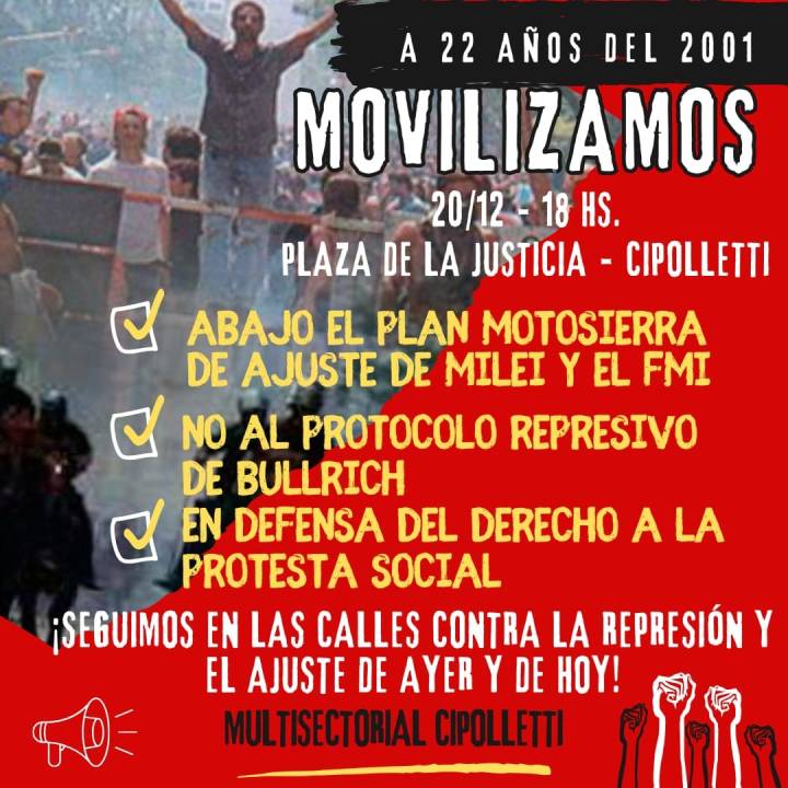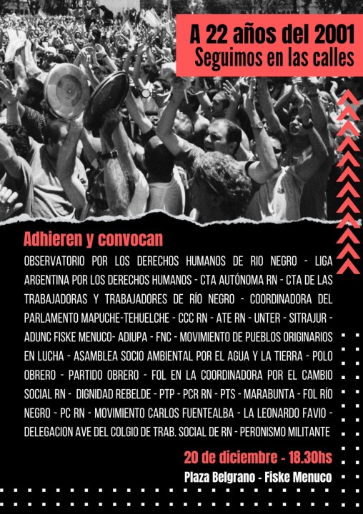 «Este 20 de diciembre nos encuentra nuevamente en las calles. A 22 años del argentinazo, recordamos esos días de lucha y rebeldía contra el ajuste, flexibilización y la miseria de entonces. Tanto por ayer como por hoy, seguimos visibilizando y denunciando el saqueo y el ajuste» manifestaron desde la multisectorial de Cipolletti.