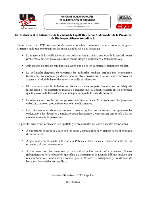 La seccional Cipolletti del gremio docente Unter publicó una carta abierta dirigida al gobernador Alberto Weretilneck, en el contexto del 121 aniversario de la ciudad. Pidieron al mandatario que «retome la cordura».