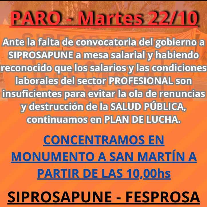 Además adelantaron que habrá un plan de lucha unificado de todos los sectores por todos los puntos del pliego. Sumaron que participarán de la marcha universitaria de este miércoles. Además presentarán un acta solicitando paro el 25 de octubre a la CTA, ATE Nacional, UPCN, SEN y Siprosapune.