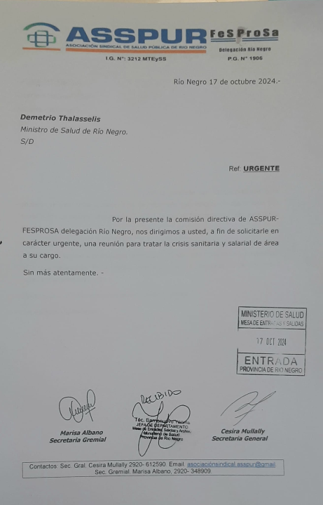 La solicitud del gremio de Salud se sumó al pedido público de encuentro con el gobernador Alberto Weretilneck, presentado el pasado 7 de octubre. «Venimos denunciando la situación crítica en la que se encuentran nuestros hospitales. La falta de insumos básicos, el cierre de servicios esenciales y los bajos salarios ponen en riesgo la salud de toda la población«, aseguraron en aquel momento.