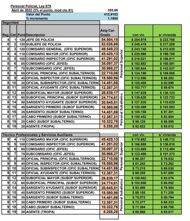 El nuevo esquema se estructuró en base a un plus remunerativo, bonificable y movible, que lleva el mínimo a los 85.012 pesos en el cargo inicial en el suboficial en el Agrupamiento Seguridad y 65.017 pesos en el Profesional, Técnico y Servicios, en ambos casos, sin adicional por viviendas.