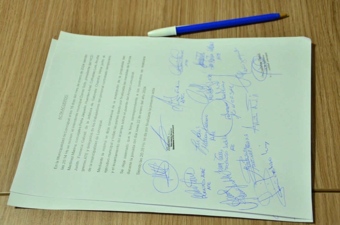 El acta acuerdo que destrabó el conflicto se firmó esta tarde, en la sede del municipio, entre el jefe comunal y el delegado de ATE, Luis Huenten, quien más temprano había anunciado el corte parcial de la Ruta provincial 21, en el acceso al pueblo, por la falta de respuestas.
