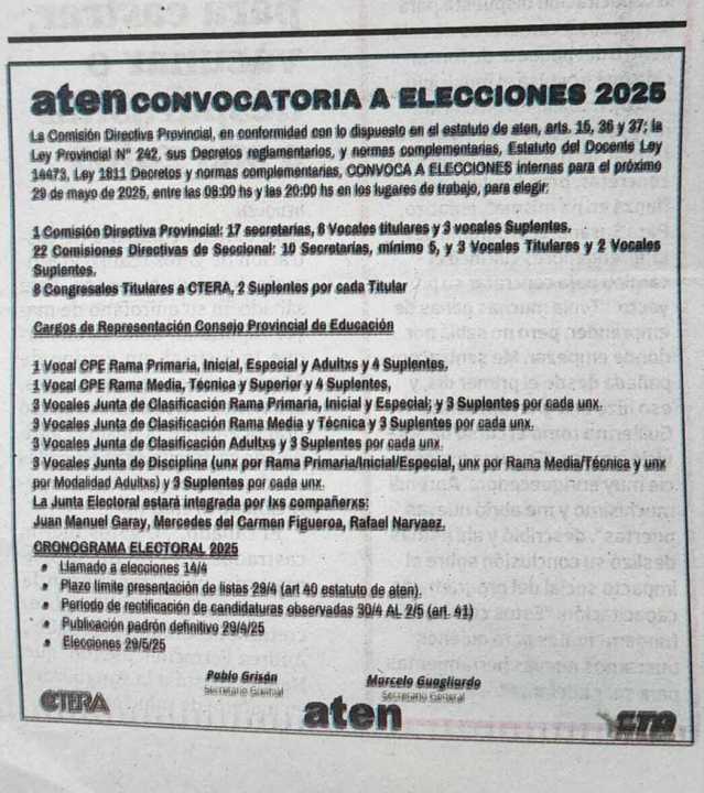 ¿Cuándo irán a las urnas? Según lo difundido desde ATEN Provincia, se «convoca a elecciones internas para el próximo 29 de mayo de 2025, entre las 8 horas y las 20 en los lugares de trabajo».