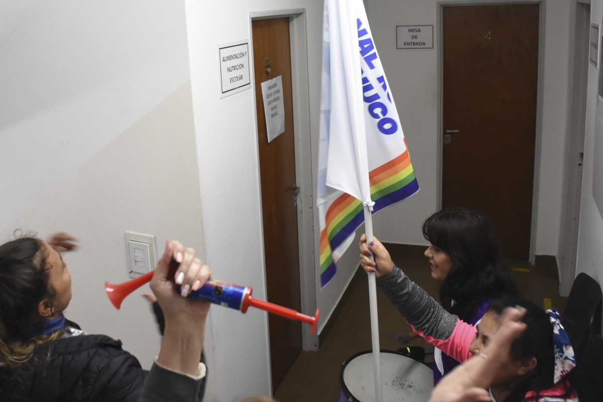 «Vinimos a la coordinación por temas pendientes», dijo Patricia Ponce, la secretaria general de la seccional Roca, quien con redoblante en mano encabezó el ingreso a las oficinas de Educación ubicadas en Tucumán casi Don Bosco.