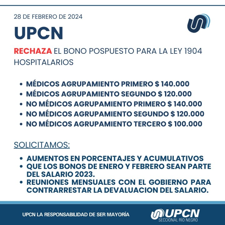 Ratificando posturas anteriores, la seccional Río Negro de UPCN rechazó la nueva oferta salarial del Ejecutivo que consiste en el pago de bonos, por planilla complementaria, de entre 100.000 y 140.000 pesos para los trabajadores estatales.